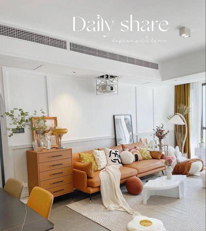 沙发背景墙刷了白色拼接奶咖色墙漆,再用石膏线做了边框造型,丰富空间的立体感和层次感,没有挂任何装饰画,特别简洁大方,吊顶下面装了投影仪,在家也能观看大荧幕电影,棕色的皮质沙发气质和颜值都是绝佳,包括旁白的斗柜也是同样的色调,时尚又复古,看着很协调,地毯是更换前后拍摄的,一个是抽象图案的羊毛地毯,一个是条纹地毯,分别彰显出了温暖和时尚感,其实偶尔更换一下软装,整个家居氛围也会不一样,时刻都能保持新鲜感。