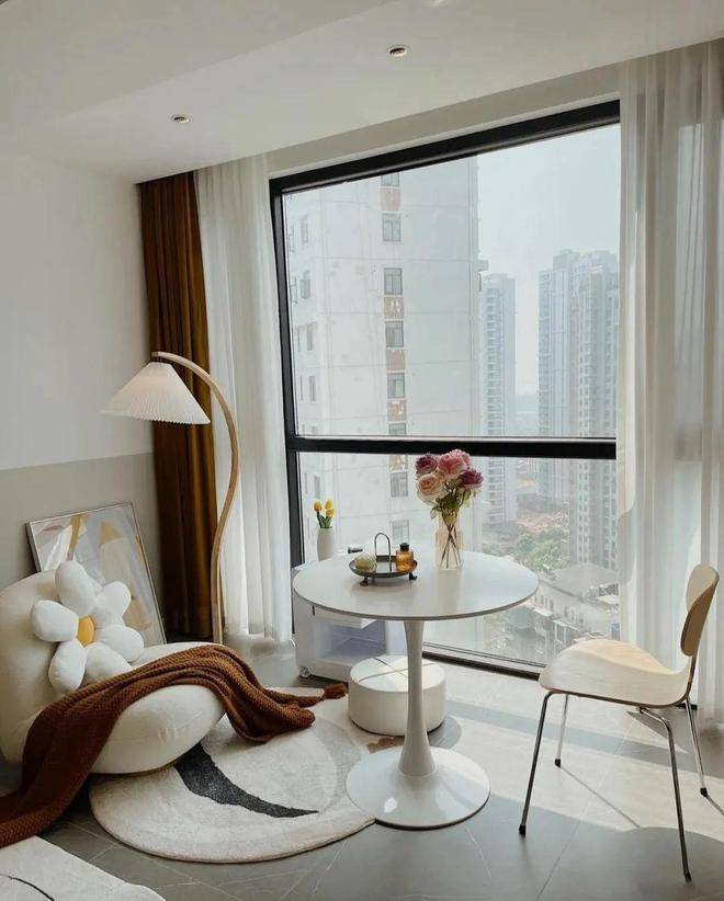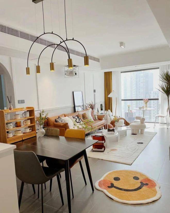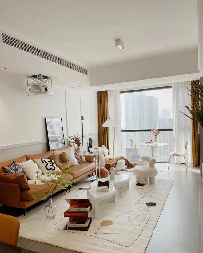 客厅是最让人眼前一亮的地方,虽然没有做过多的装饰,但是不管是家具的布置还是软装搭配都十分巧妙,比如皮质沙发与羊毛地毯结合,散发着一种温暖的气质,白色背景墙与灰色地砖也是格外的简洁大方,尤其是外面的阳台落地窗,放眼望去,满眼都是蓝天白云,好像走进了漫画世界一样,美极了,简直就是一场视觉盛宴,相当治愈,这样的家可以说比样板还美,真是越看越喜欢。