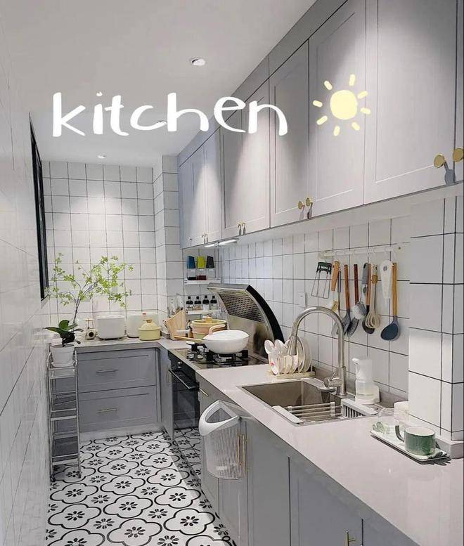 厨房以黑白灰为主,经典耐看,白色的格子墙砖显得格外的明亮清爽,灰色橱柜质感很强,搭配金色拉手,高级又精致,地面铺了黑白色小花砖,削弱了瓷砖自带的冰冷感,特别小清新,L型的橱柜布局合理规划利用了空间,操作灵活,储物也充足。