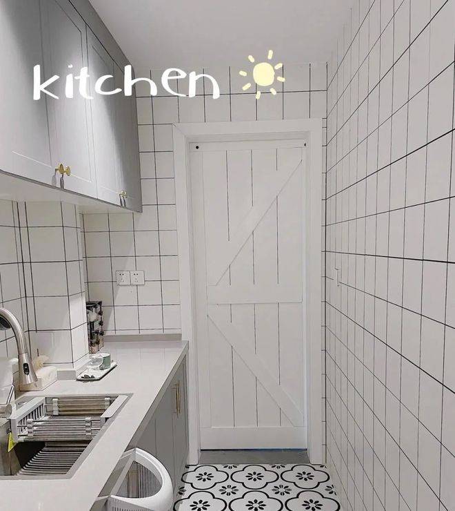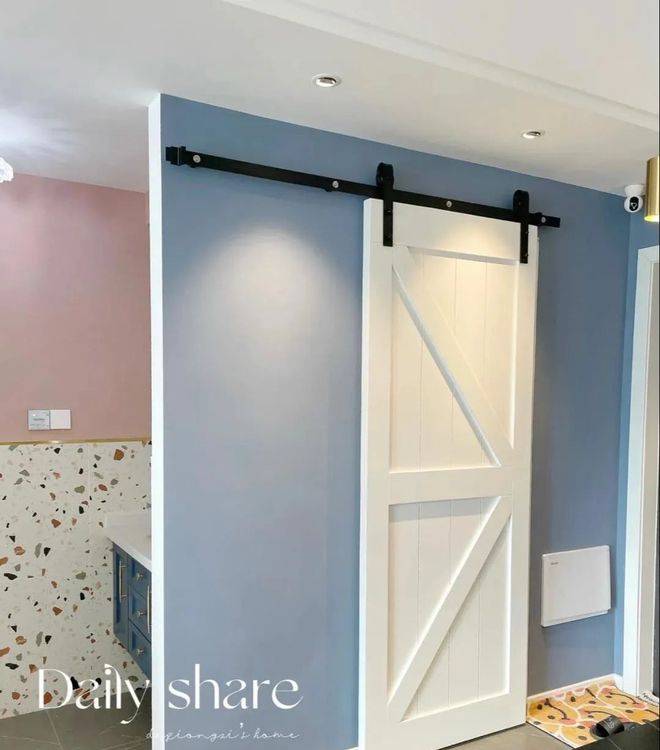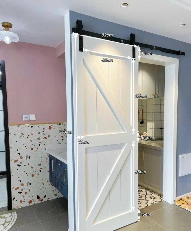 进门的右手边是厨房,依然延续了入户的灰蓝色背景墙,很清爽,安装了白色谷仓门,开关方便,不占位置,小清新和文艺范儿十足,颜值很高,上面标记了尺寸,喜欢的朋友可以借鉴一下,隔断墙后面便是洗漱区。