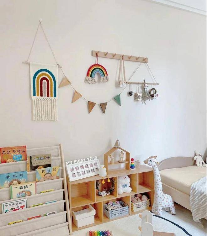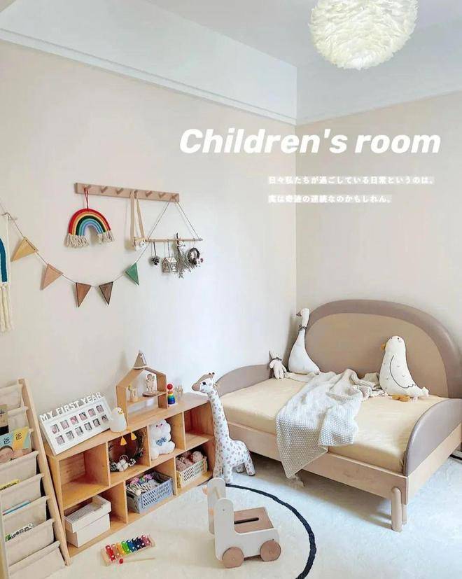 这间是孩子的儿童房,只有7平米,墙面都刷成了奶咖色,特别温暖亲切,房间的布置与传统的儿童房不一样,土司床紧靠墙壁摆放,不占地方,这个床是可以自由伸缩的,以后孩子长大了也能够正常的使用,地上铺了地毯,方便孩子爬行玩耍,床尾的开放柜子和绘本收纳架,可拿来放一些玩具和读物,方便拿放。