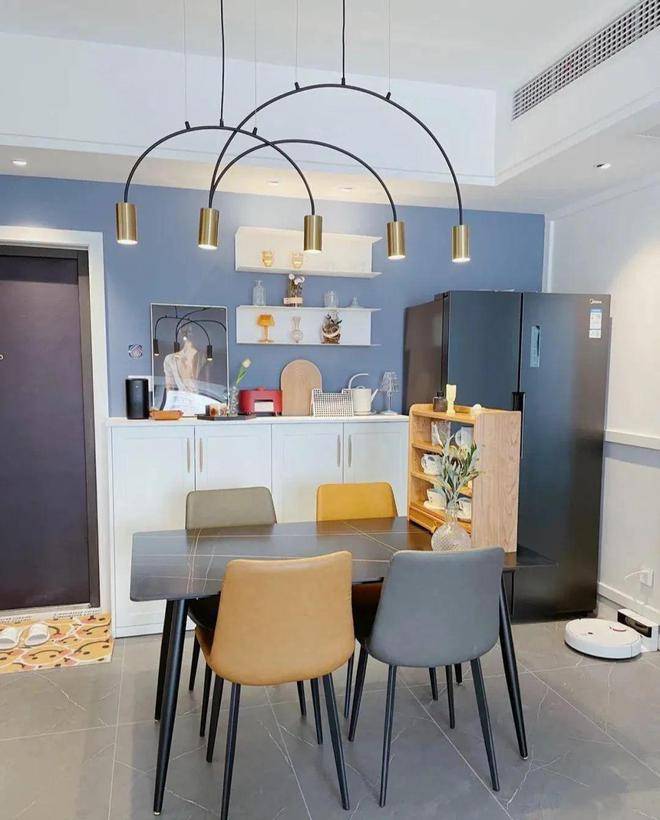 餐厅里面,灰色岩板餐桌与地面颜色相互呼应着,整体感很强,视觉很和谐,搭配灰色和棕色餐椅,既高级又温暖,加上两盏弧形黄铜吊灯点缀,精致极了,整个用餐环境的格调都被提升了不少,鞋柜旁边提前留出了摆放冰箱的位置,整洁不突兀,还为厨房节省了不少空间。