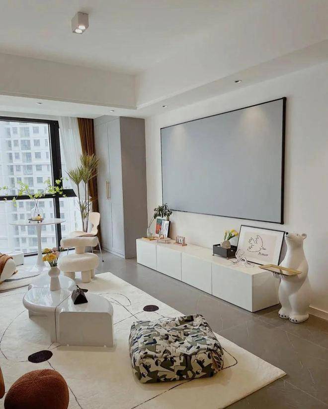考虑到要挂一个大尺寸的电视,为了不显累赘,所以电视墙没有做任何造型装饰,就是以大白墙为主,十分简单大方,搭配白色的地台电视柜,简洁又利落,平时打扫卫生也很方便,电视柜上放了一些装饰画和摆件,增加艺术气息,旁边的小熊摆架也很意思,给空间增加了几分趣味性。