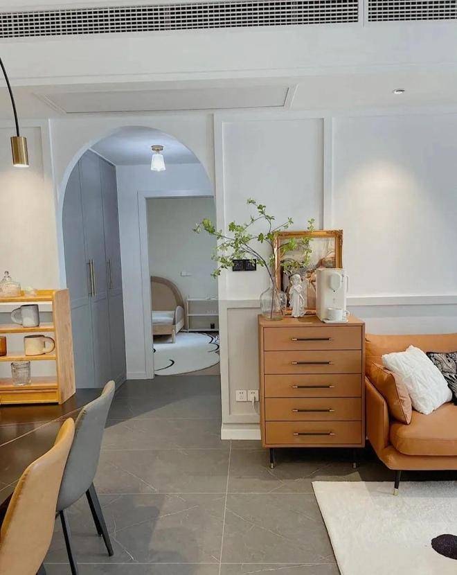 进入卧室的过道墙设计了拱形门洞,复古典雅又时尚浪漫,充满了艺术气息,同时也给家里增加了神秘感和趣味性,里面过道墙定制了一个壁柜,可拿来收纳一些家居杂物和换季衣物棉被。