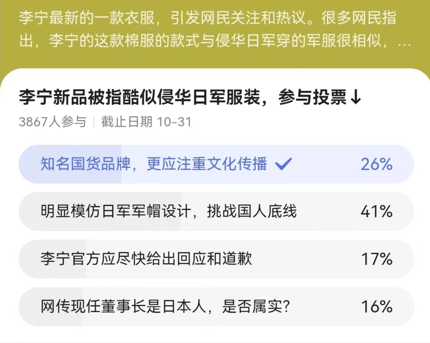 网友质疑李宁的衣服像日军的衣服。 这便是侵略名誉权吗? 没想到,要让一切网友看到这顶“屁帘”帽子,竖起大拇指称誉。 这是我国的自豪,民族的( 化代表)?