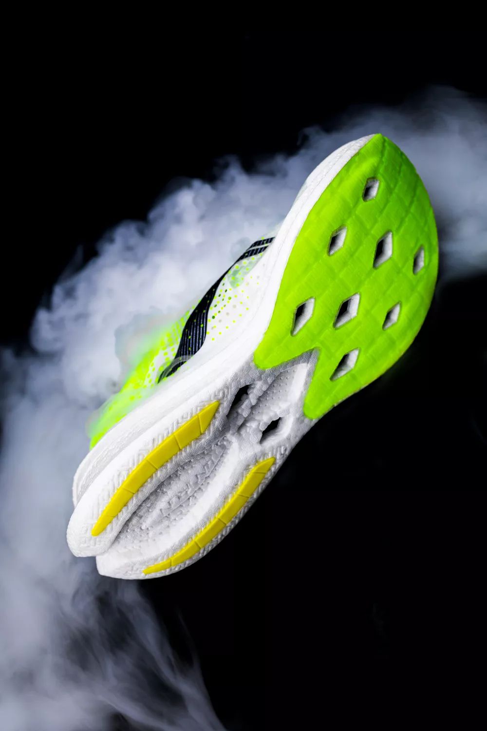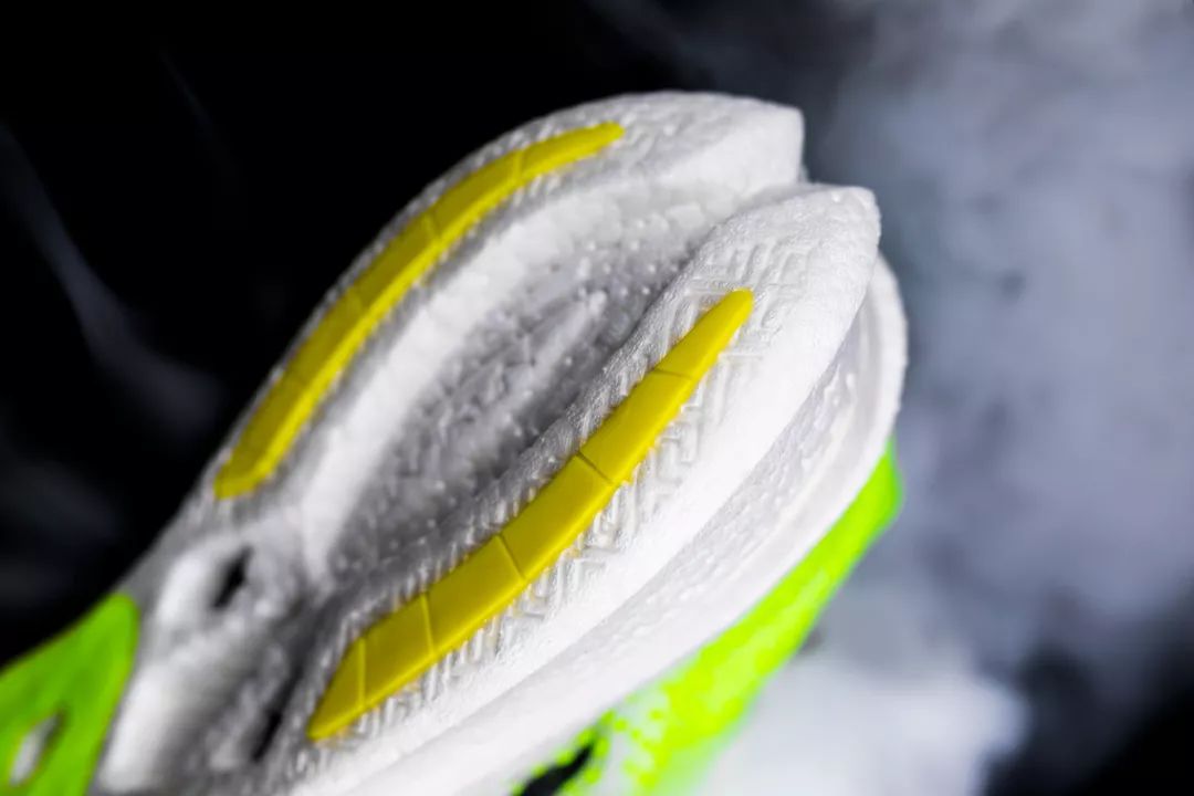 这双鞋采用了亮眼的荧光色贯穿,不只有着夺目的吸睛效果,一起也能提示旁人,有跑者正在经过,在某些特定的程度上提高了跑步运动的安全性。