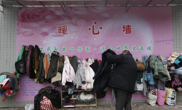 邻近的商贩称,昨日早上这面“暖心墙”就已呈现。其时只挂有几件衣服,到了下午,衣服逐渐多了起来,有人拿衣服过来放,也有人将它取走。图为市民在“暖心墙”前选择御寒衣物。