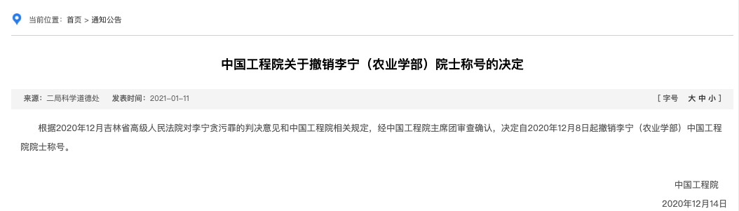 中国工程院的通告称,根据 2020年12月吉林省高级人民法院对李宁贪污罪的判决意见和中国工程院相关规定,经中国工程院主席团审查确认,决定自 2020 年 12 月 8 日起撤销李宁(农业学部)中国工程院院士称号。