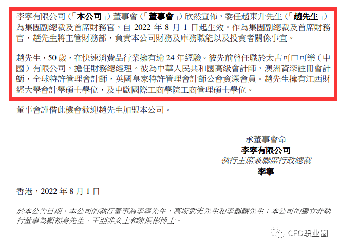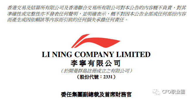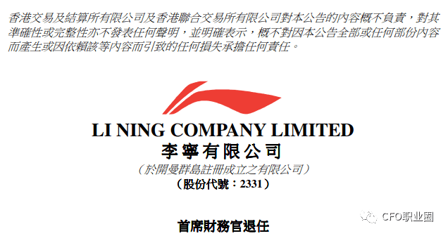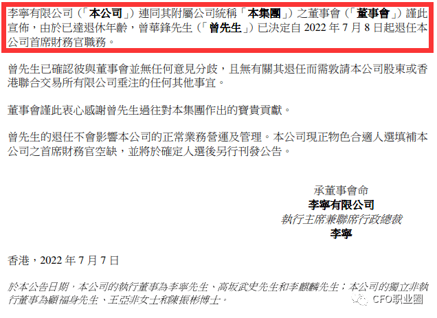 7月7日,李宁在港交所公告,因为已达退休年龄,曾华锋已决议自2022年7月8日起退任公司首席财政官职务。